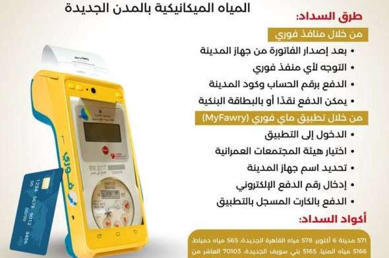 أعلنت وزارة الإسكان أنه تم إتاحة السداد لفواتير مياه تلك العدادات من خلال منافذ فوري وتطبيق الهاتف المحمول "ماي فوري".