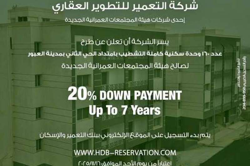 تطرح شركة التعمير للتطوير العقاري تورك التابعة لهيئة المجتمعات العمرانية الجديدة نحو 160 وحدة سكنية كاملة التشطيب بامتداد الحي الثاني بالعبور بمساحات متنوعة، لتبدأ عمليات الحجز بسداد 20% و7 سنوات لاستكمال آلية السداد.