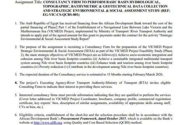 حصلت جمهورية مصر العربية على تمويل من بنك التنمية الإفريقي لتكلفة التمويل الجزئي للمرحلة الثانية الجزء الأول من إنشاء خط ملاحي بين بحيرة فيكتوريا والبحر المتوسط (VICMED) الذي تنفذه وزارة النقل هيئة النقل النهري وتعتزم لتطبيق جزء من المبلغ المتفق عليه لهذه المنحة على المدفوعات بموجب العقد لنشاط "تقرير دراسة التقييم البيئي والاجتماعي الاستراتيجي"