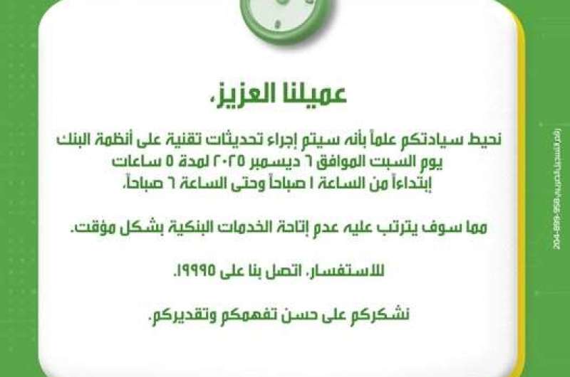 وجه بنك التعمير والإسكان رسالة عاجلة لكافة العملاء بأنه سيتم إجراء تحديثات تقنية على أنظمة البنك يوم السبت الموافق6 ديسمبر 2025لمدة 5 ساعات إبتداءاً من الساعة1 صباحاً وحتى الساعة 6 صباحاً، مما سوف يترتب عليه عدم إتاحة الخدمات البنكية بشكل مؤقت.