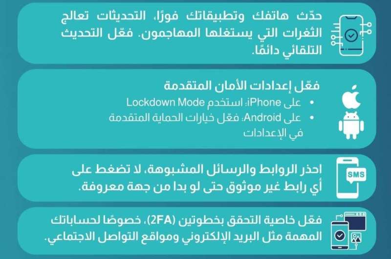 الخطوات تضمنت أيضًا تفعيل إعدادات الأمان المتقدمة علي IPhone باستخدام Lockdown، أما بالنسبة لـ Android فيتم تفعيل خيارات الحماية المتقدمة في الإعدادات، كما يتم الحذر من الروابط والرسائل المشبوهة، ولا تضغط علي أية من هذه الروابط غير الموثوقة حتى لو بدا من جهة معروفة.
