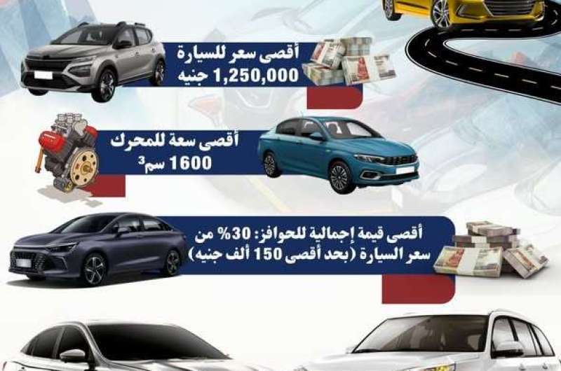 • أقصي سعر للسيارة المستفيدة من الحوافز هو 1.3 مليون جنيه وأقصي سعة للمحرك 1600سم3، وأقصي قيمة لإجمالي الحوافز %30 من سعر السيارة تسليم باب المصنع بحد أقصى 150 ألف جنيه.