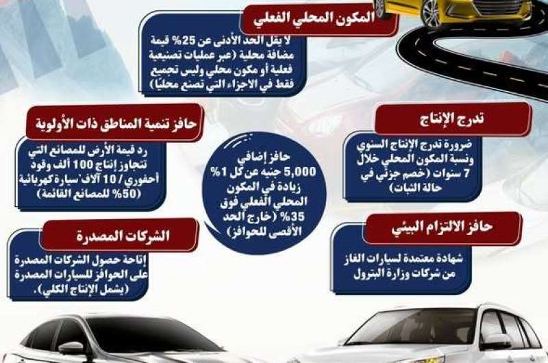 • وفي حالة تجاوز 35% من المكون الصناعي المحلي المستهدف يتم منح المصنع حافز اضافي 5 آلاف جنيه عن كل زيادة 1% في المكون الصناعي المحلي المستهدف الفعلي لكل سيارة خلال فترة البرنامج (خارج الحد الاقصى للحوافز) على أن تكون الزيادة عبارة عن (مكون محلي فعلي- عمليات تصنيعية إضافية- منتج جديد).