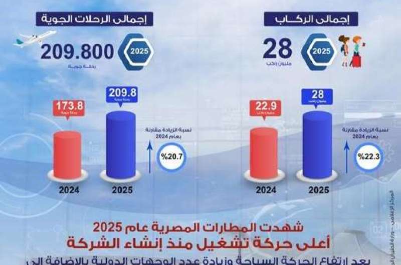 في إطار المتابعة المستمرة لمؤشرات أداء حركة التشغيل داخل المطارات المصرية، ووفقًا للبيانات التشغيلية المعتمدة التي أظهرتها إحصائيات الحركة الجوية والسياحية الوافدة من وإلى مناطق الجذب السياحي بجمهورية مصر العربية، حققت المطارات المصرية التابعة للشركة المصرية للمطارات طفرة غير مسبوقة في معدلات التشغيل خلال عام 2025 مقارنة بعام 2024، بما يعكس قوة الأداء وانتظام التشغيل وارتفاع كفاءة منظومة الطيران المدني.