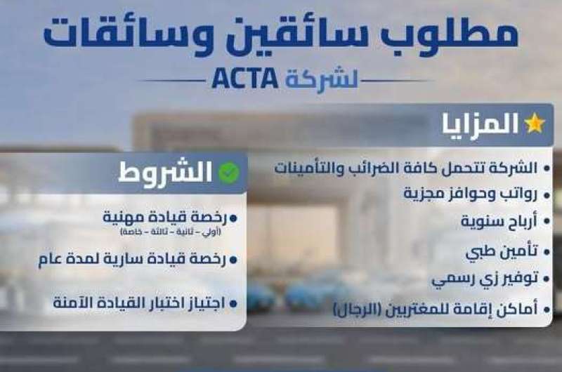 أعلنت شركة اكتا التابعة لوزارة النقل عن حاجتها لسائقين وسائقات بمزايا وحوافز كبيرة تتضمن قيام الشركة بتحمل كافة الضرائب والتأمينات، بالإضافة إلى وجود رواتب مجزية بأرباح سنوية مع وجود تأمين طبي، علي أن يتم توفير زي رسمي وإقامة للمغتربين.