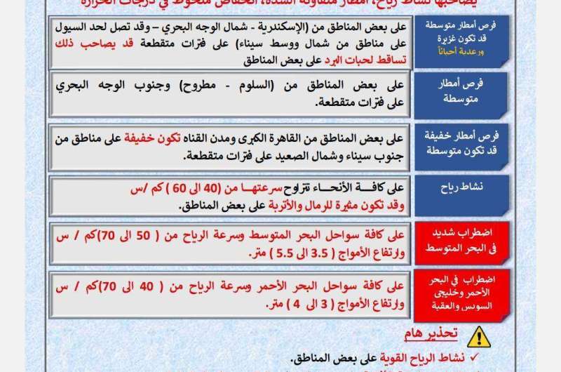 وتصل سرعة الرياح ما بين 0 حتى 60 كيلو مترًا في الساعة، كما يشهد البحر المتوسط اضطراب في حركة الملاحة، والامواج تصل لما بين 3.5 حتى 5.5 متر، بينما تصل في البحر الأحمر ما بين 3 إلى 4 أمتار.