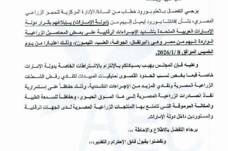 أخطرت دولة الإمارات العربية المتحدة الإدارة المركزية للحجز الزراعي المصري بتشديد الإجراءات الرقابية علي بعض المحاصيل الزراعية الواردة إليهم من مصر، ولعل أهمها البرتقال والجوافة والعنب والليمون، وذلك اعتبارًا من أول أمس.