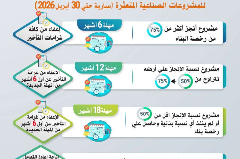 وتشمل التيسيرات منح مهلة 6 أشهر للمشروعات الحاصلة على رخصة البناء وقامت بتنفيذ نسبة بنائية تجاوزت 75% من رخصة البناء، مع إعفائها من كامل غرامات التأخير، وذلك من أجل استكمال تنفيذ المشروع وتدبير الآلات والمعدات اللازمة للتشغيل واستخراج رخصة التشغيل والسجل الصناعي خلال فترة الستة أشهر الممنوحة.
