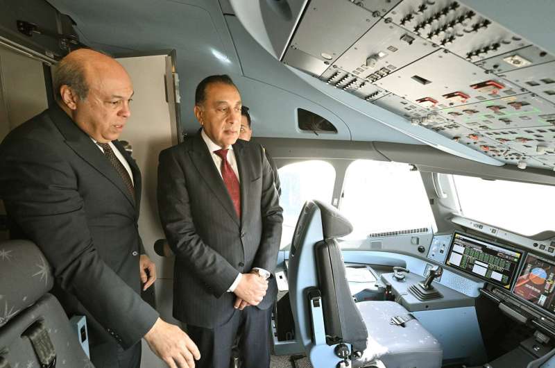 خلال فعاليات الاحتفال بانضمام أول طائرة من طراز Airbus A350-900 إلى أسطول الناقل الوطني، تفقد الدكتور مصطفى مدبولي، رئيس مجلس الوزراء، ومرافقوه، الطائرة الجديدة منAirbus ، التى تأتي ضمن صفقة أبرمتها شركة "مصر للطيران" مع شركة "Airbus" لضم 16 طائرة من طراز A350-900 للأسطول الوطني.