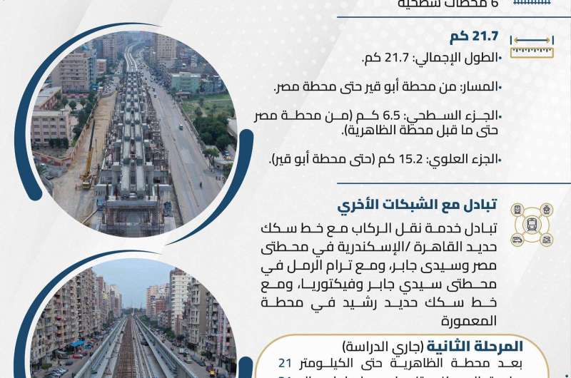 أما بالنسبة للمرحلة الثانية والتي يجري دراستها حاليًا فتمتد من محطة الظاهرية حتى الكيلو 21 بطريق الإسكندرية/مطروح بطول إجمالي 31 كيلو مترًا وتشمل مشارًا علويًا وسطحيًا يضم 22 محطة وهو ما يقلل نزع الملكيات.