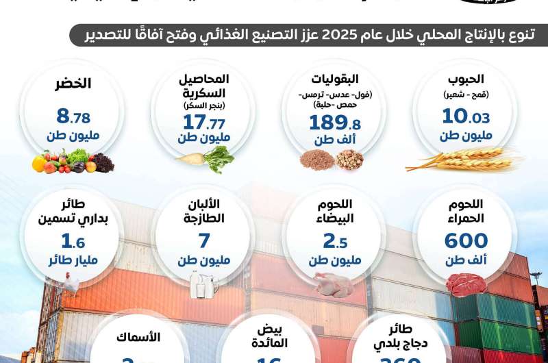 وأشارت الإنفوجرافات إلى أن تنوع الإنتاج المحلي خلال عام 2025، عزز التصنيع الغذائي وفتح آفاقًا للتصدير، حيث بلغ إنتاج الحبوب "قمح – شعير" 10.03 مليون طن، والبقوليات "فول – عدس – ترمس – حمص – حلبة" 189.8 ألف طن، والمحاصيل السكرية "بنجر السكر" 17.77 مليون طن، والخضر 8.78 مليون طن.