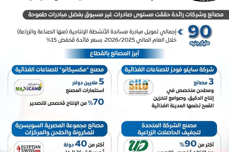 وفي سياق متصل، أبرزت الإنفوجرافات، المصانع والشركات الرائدة التي حققت مستوى صادرات غير مسبوقة بفضل مبادرات طموحة، حيث تم تمويل مبادرة مساندة الأنشطة الإنتاجية منها "الصناعة والزراعة" بـ 90 مليار جنيه خلال العام المالي 2025/2026، بسعر فائدة مخفض يصل إلى 15%.