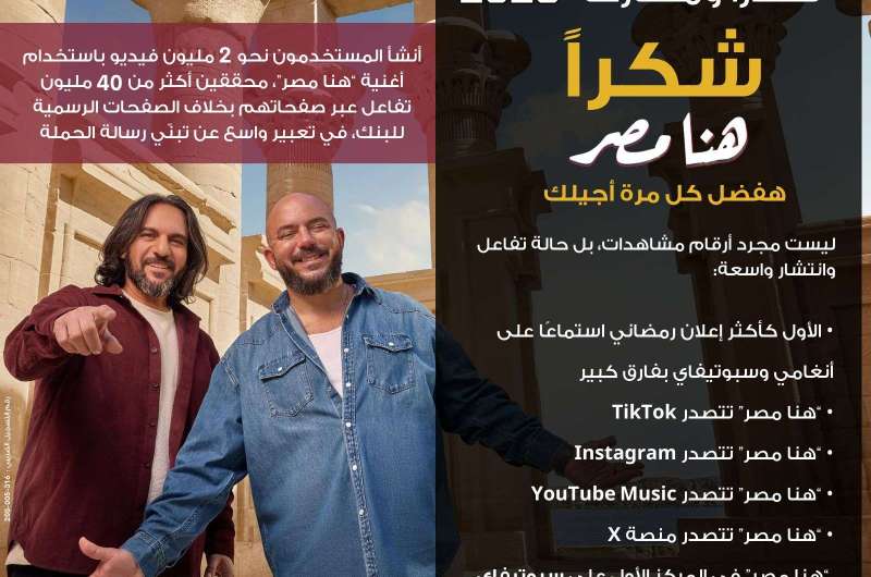 فقد أنشأ المستخدمون ما يقرب من 2 مليون فيديو باستخدام أغنية “هنا مصر” عبر منصات التواصل الاجتماعي، محققين أكثر من 40 مليون تفاعل عبر صفحاتهم، وذلك بخلاف التفاعل المحقق عبر الصفحات الرسمية للبنك التي نُشرت عليها الأغنية، في تعبير واضح عن تبنّي الجمهور لرسالة الحملة ومشاعرها.