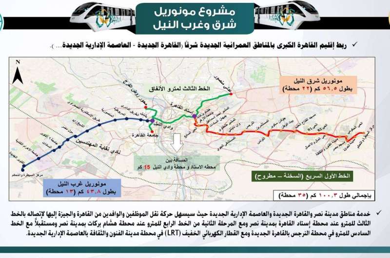 واتساقًا بذلك شهدت الأيام الأخيرة تشغيل مشروع مونوريل شرق القاهرة الممتد من محطة إستاد القاهرة بمدينة نصر وحتى مركز السيطرة والتحكم بالعاصمة الجديدة بطول 56.5 كم.