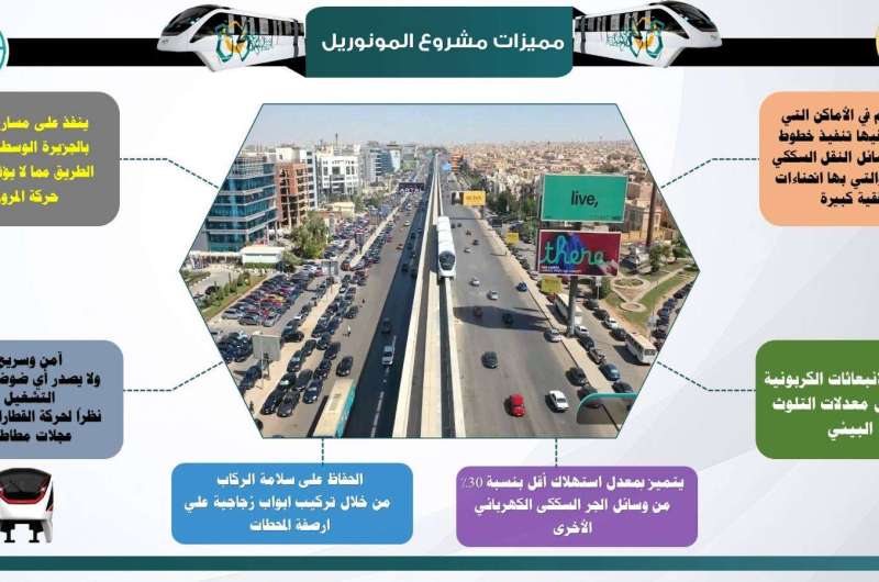 وأشار إلى أن مشروع المونوريل تم تنفيذ لأول مرة في مصر ويمثل نقلة حضارية كبيرة في وسائل النقل الجماعي، التى تتسم بأنها وسائل سريعة وعصرية وآمنة ، وتوفر استهلاك الوقود، وتخفض معدلات التلوث البيئي وتخفف الإختناقات المرورية بالمحاور والشوارع الرئيسية، وتجذب الركاب لاستخدامها بدلاً من السيارات الخاصة ، حيث يتم تشغيله بالطاقة الكهربائية (صديق للبيئة).