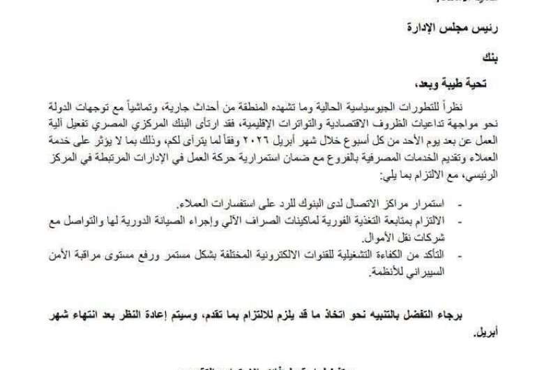 أعلن البنك المركزي المصري تفعيل آلية العمل عن بُعد داخل القطاع المصرفي يوم الأحد من كل أسبوع خلال شهر أبريل 2026، وذلك في إطار الاستجابة للتطورات الجيوسياسية الراهنة وما تشهده المنطقة من تحديات اقتصادية وأمنية.