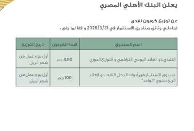 أعلن البنك الأهلي المصري عن إقرار توزيع كوبونات نقدية لحاملي وثائق صندوقيه الاستثماريين “الرابع” و“الواعد” عن الفترة المنتهية في 31 مارس 2026، وذلك في إطار السياسة الدورية للصناديق الاستثمارية التي تستهدف تحقيق عوائد منتظمة للمستثمرين.