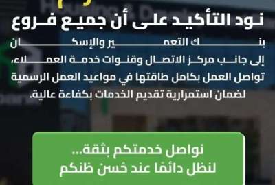 وأوضح البنك أن ذلك يأتي في إطار حرصه على تقديم تجربة مصرفية متميزة، مع جاهزية كافة قنوات التواصل لتلبية احتياجات العملاء والاستجابة لاستفساراتهم بشكل سريع وفعال.
