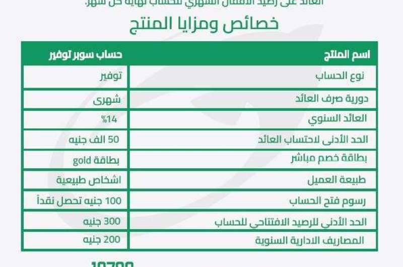 يقدّم البريد المصري حساب سوبر توفير الشهري بعائد سنوي يصل إلى 14% يُصرف شهريًا، مع حد أدنى لاحتساب العائد يبدأ من 50 ألف جنيه، إلى جانب مجموعة من المزايا المصرفية المتنوعة.