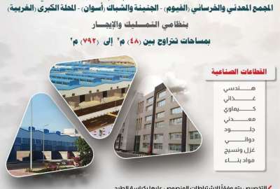 وفي إطار استراتيجية وزارة الصناعة لتوطين الصناعة ودعم سلاسل الإمداد، أعلنت الدكتورة ناهد يوسف رئيس الهيئة العامة للتنمية الصناعية عن طرح 414 وحدة صناعية كاملة التجهيزات والمرافق داخل 12 مجمعًا صناعيًا بـ 11 محافظةً، وذلك بنظامي التمليك والإيجار وفقًا للمنصوص عليه بكراسة الطرح، عبر منصة مصر الصناعية الرقمية:madein.eg علي أن يتم التقدم على الوحدات إلكترونيًا من اعتبارًا من 5 إلى 19 أبريل 2026 .