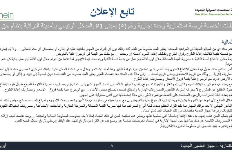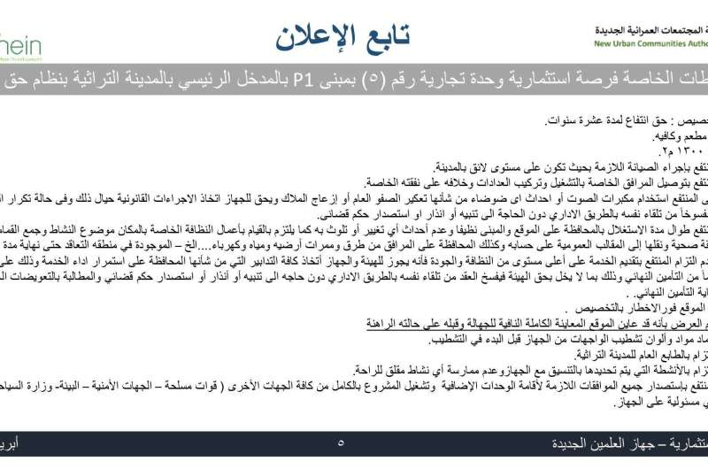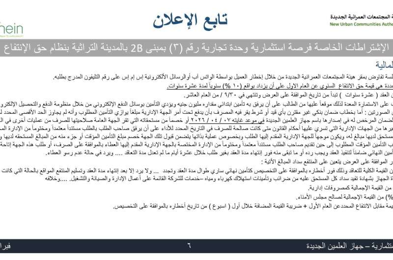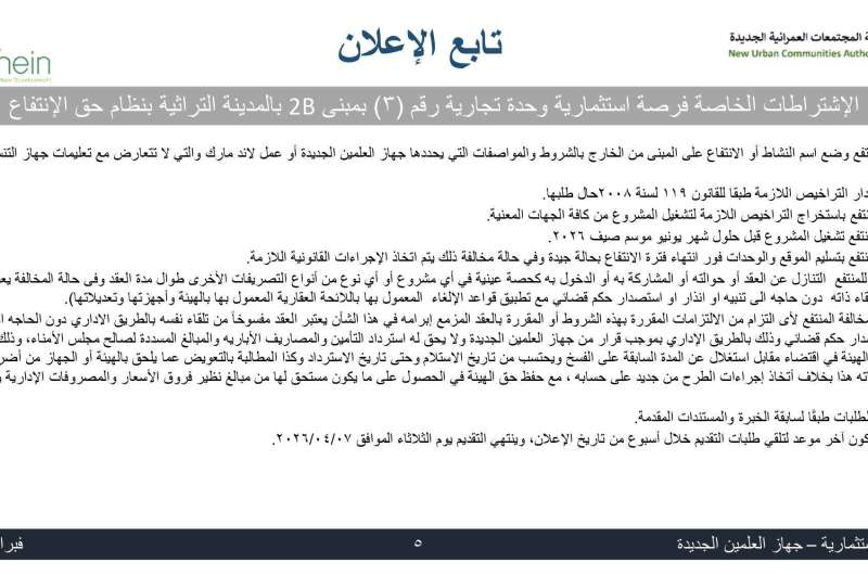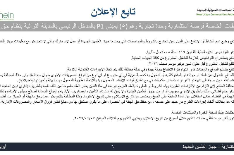 وأوضح رئيس الجهاز أن الطرح يشمل عددًا من الأنشطة الاستثمارية المتنوعة، تتضمن مطعمًا وكافيه بمبنى P1 بالمدخل الرئيسي للمدينة التراثية، إلى جانب نشاط تجاري بالوحدة رقم (3) بمبنى 2B بجوار "جملة ماركت"، وذلك في إطار تعزيز الشراكة مع القطاع الخاص لتطوير الأنشطة السياحية والخدمية واللوجستية.
