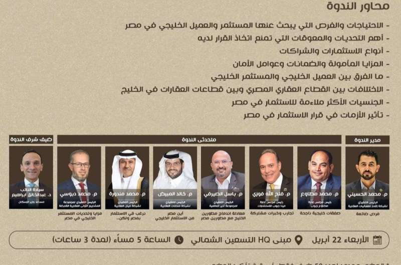 وتناقش الندوة عددًا من المحاور المهمة، من أبرزها: الفرص التي يبحث عنها المستثمر والعميل الخليجي داخل السوق المصري، والتحديات التي قد تؤثر على قرارات الاستثمار، إلى جانب استعراض أنواع الشراكات والاستثمارات المتاحة، وأهم الضمانات وعوامل الأمان المطلوبة.