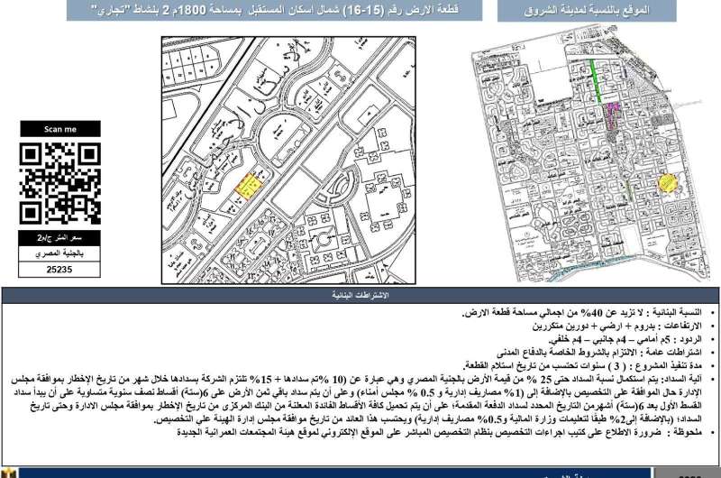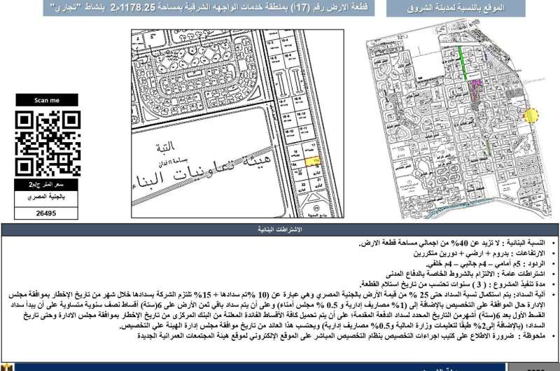 وتشمل الطروحات قطعة أرض بمركز خدمات المجاورة الأولى بالحي الثالث بمساحة 5166.2 متر مربع بنشاط مدرسة بسعر 10335 جنيهًا للمتر المربع، وقطعة أرض بمنطقة خدمات الواجهة الشرقية بمساحة 1178.25 متر مربع بنشاط تجاري بسعر 26495 جنيهًا للمتر المربع، إلى جانب قطعتي أرض شمال إسكان المستقبل بمساحة 1800 متر مربع بنشاط تجاري بسعر 25235 جنيهًا.