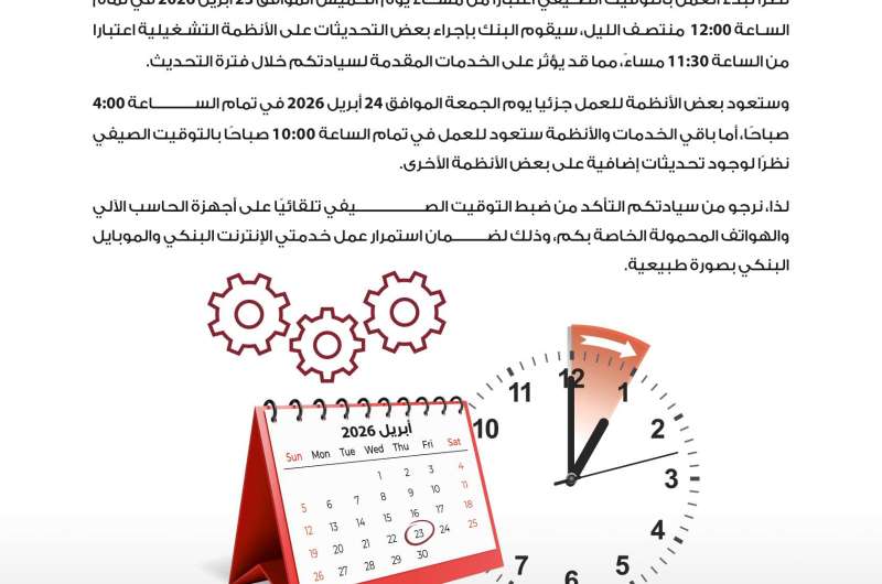 وأضاف أن بعض الأنظمة ستعود للعمل بشكل جزئي صباح الجمعة 24 أبريل 2026 في تمام الساعة 4:00 صباحًا، بينما سيتم استئناف التشغيل الكامل لباقي الخدمات والأنظمة في تمام الساعة 10:00 صباحًا بالتوقيت الصيفي، وذلك عقب الانتهاء من التحديثات الفنية الإضافية.