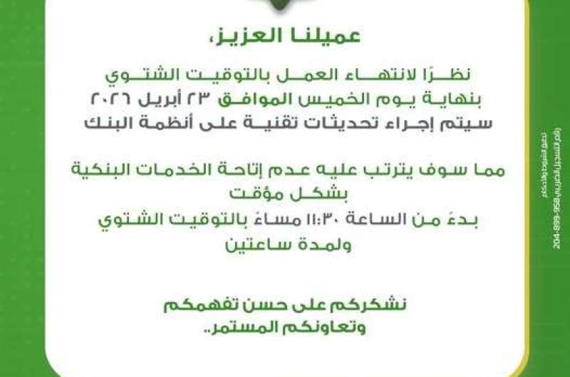 ودعا البنك عملاءه إلى التأكد من ضبط ساعات أجهزتهم وفق التوقيت الصحيح قبل تنفيذ أي معاملات بنكية تتطلب استخدام رمز التحقق المتغير (OTP)، لضمان إتمام العمليات دون أي معوقات.