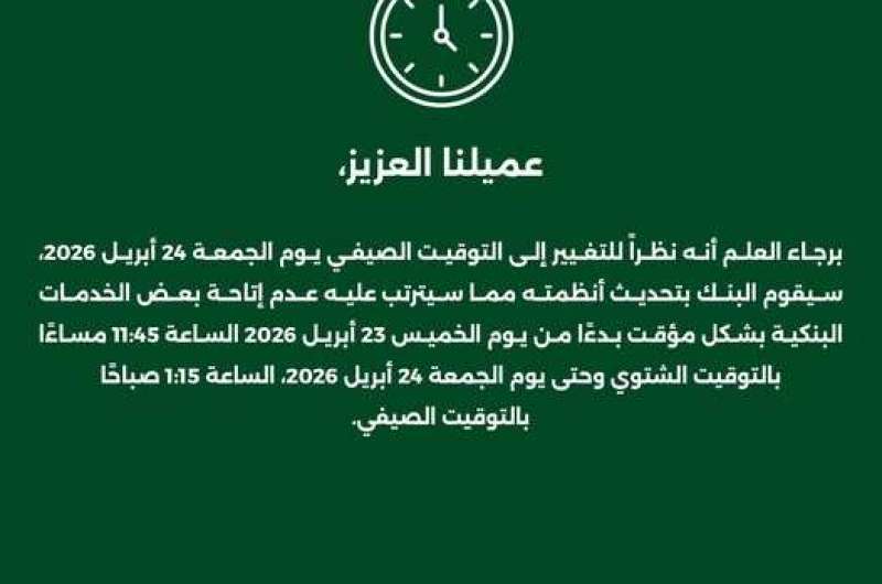 وأوضح البنك أن هذه التحديثات قد يترتب عليها عدم إتاحة بعض الخدمات المصرفية بصورة مؤقتة، وذلك اعتبارًا من الساعة 11:45 مساءً يوم الخميس 23 أبريل 2026 بالتوقيت الشتوي، وحتى الساعة 1:15 صباحًا يوم الجمعة 24 أبريل 2026 بالتوقيت الصيفي.
