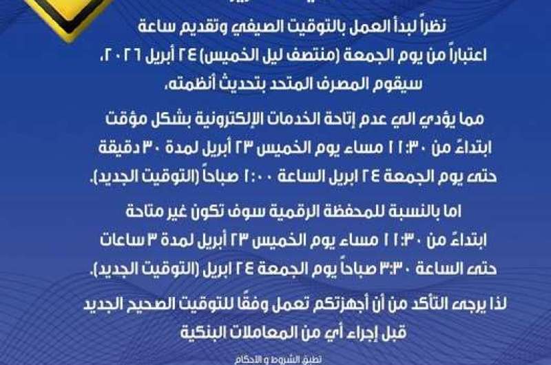 ودعا المصرف العملاء إلى التأكد من ضبط الهواتف المحمولة والأجهزة الإلكترونية على التوقيت الجديد تلقائيًا، قبل إجراء أي معاملات مصرفية، لضمان استمرار استخدام الخدمات البنكية بشكل طبيعي.