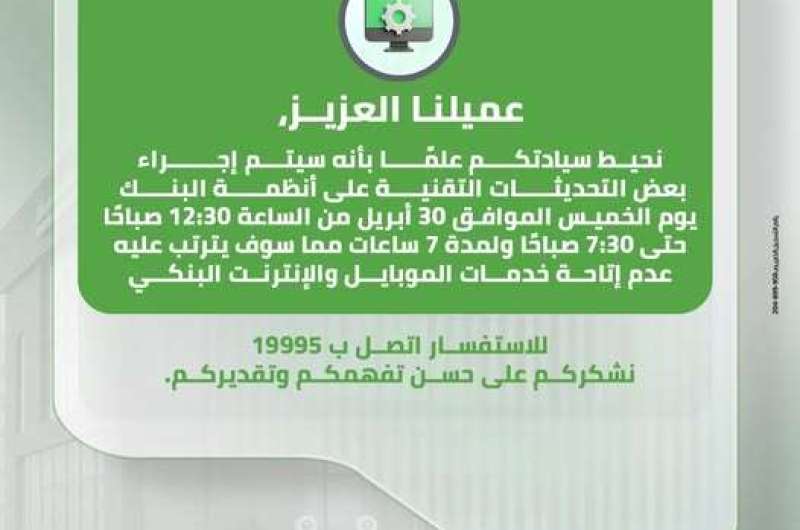 وأوضح البنك أن هذه التحديثات سيترتب عليها عدم إتاحة خدمات الموبايل البنكي والإنترنت البنكي خلال الفترة المحددة، على أن تعود الخدمات للعمل بصورة طبيعية فور الانتهاء من أعمال التحديث.