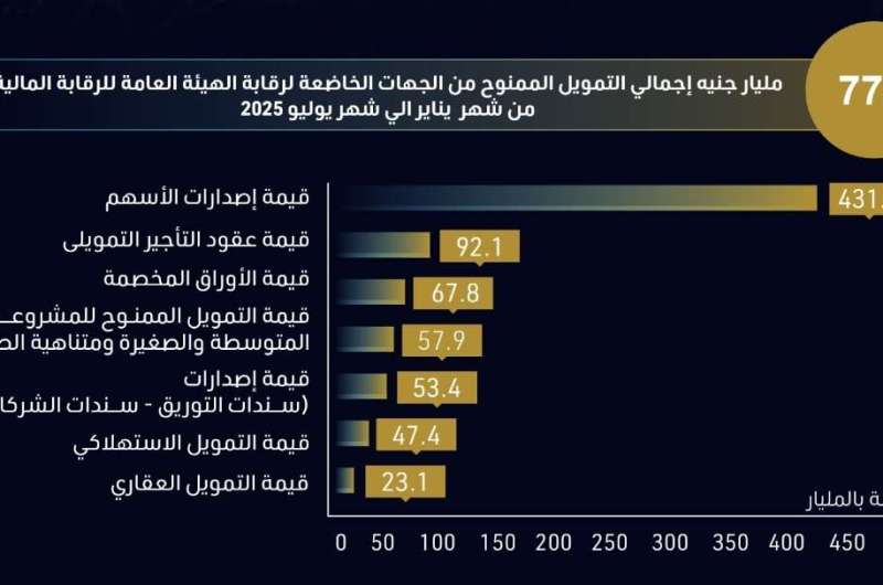أظهرت أحدث التقارير الصادرة من الهيئة العامة للرقابة المالية، أن إجمالي التمويل الممنوح من خلال الجهات الخاضعة لرقابة الهيئة (أنشطة سوق رأس المال، أنشطة التمويل غير المصرفي) بلغ قيمته 773 مليار جنيه خلال الفترة من يناير إلى نهاية شهر يوليو 2025 وذلك على النحو التالي 431.4 مليار جنيه قيمة إصدارات الأسهم و53.4 مليار جنيه قيمة إصدارات الأوراق المالية بخلاف الأسهم.